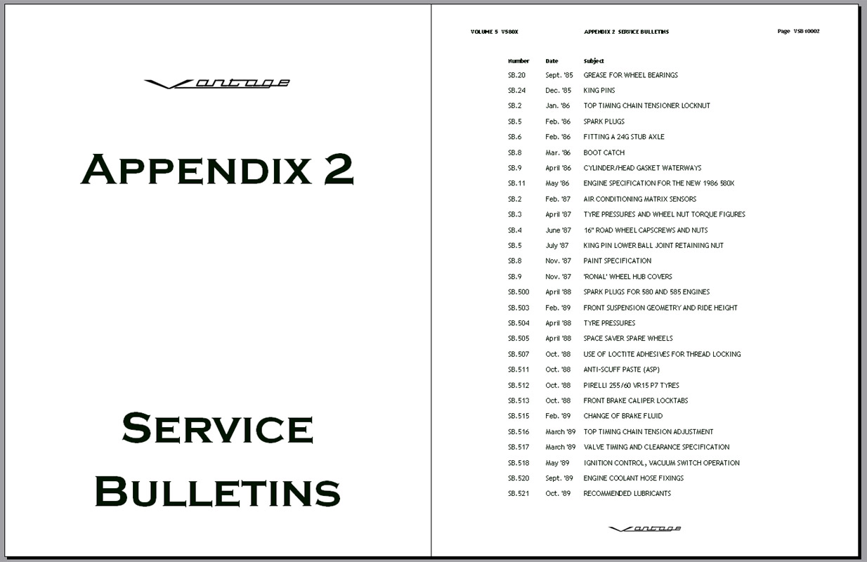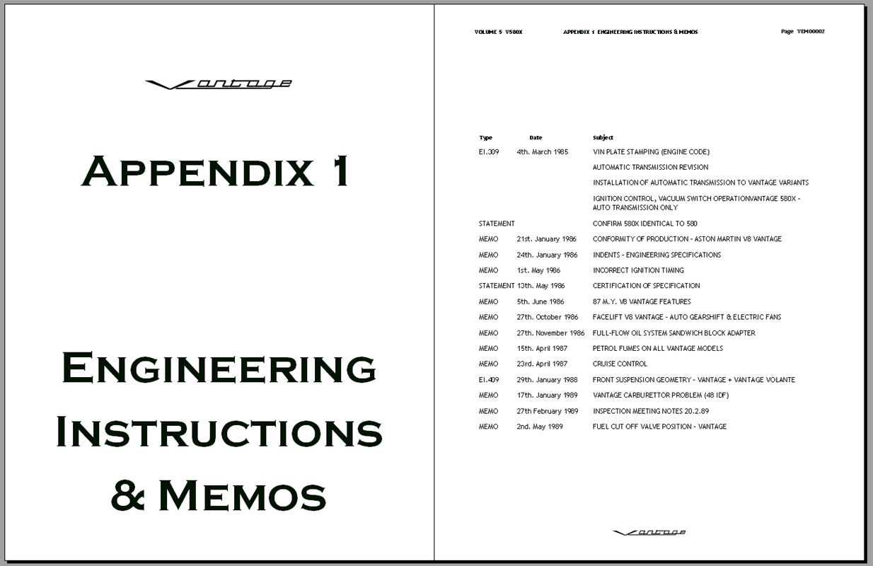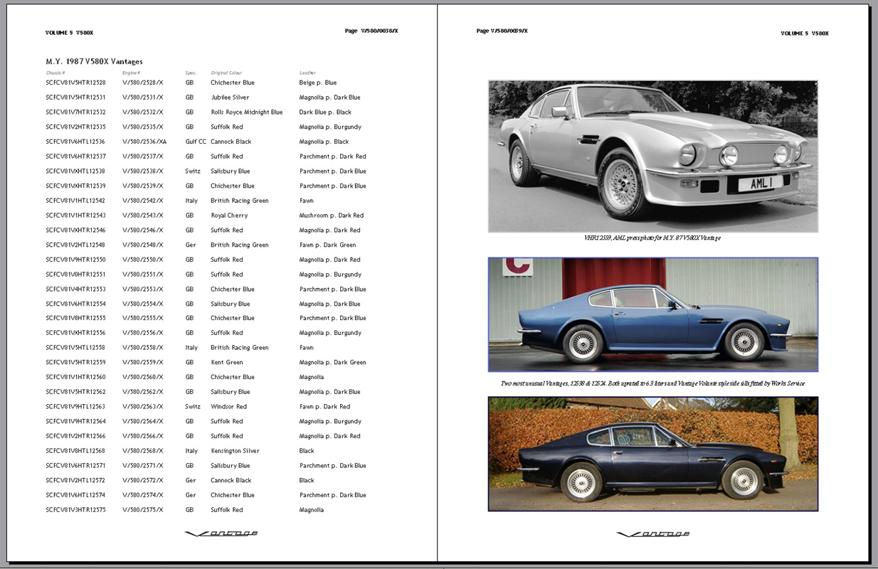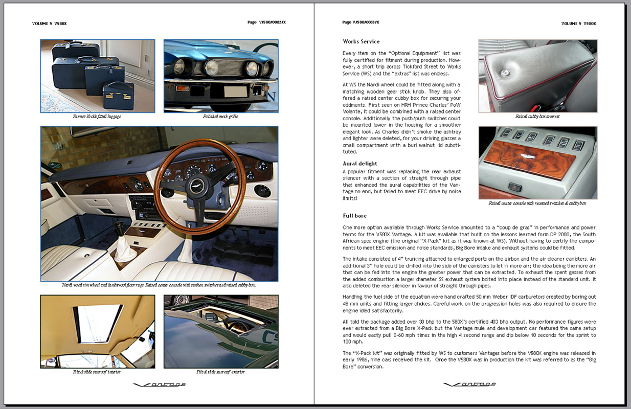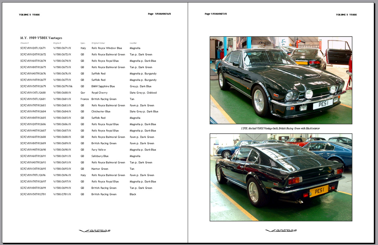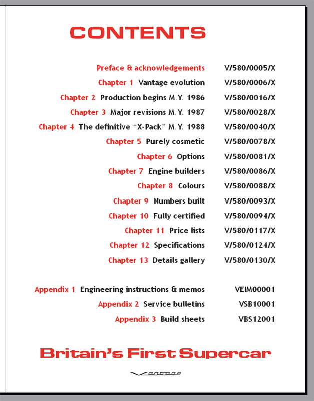 Contemporary road tests in full colour Full options list for V580X Engine builder plates Colour charts for each Vantage built Every V580X Vantage build sheet Service bulletins Engineering instructions & memos Certification records Price lists |